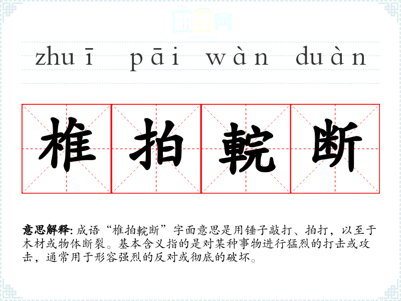 成语“椎拍輐断”字面意思是用锤子敲打、拍打,以至于木材或物体断裂。基本含义指的是对某种事物进行猛烈的打击或攻击,通常用于形容强烈的反对或彻底的破坏。