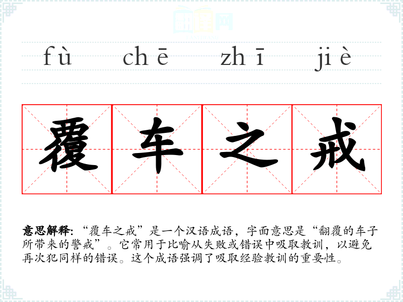 “覆车之戒”是一个汉语成语,字面意思是“翻覆的车子所带来的警戒”。它常用于比喻从失败或错误中吸取教训,以避免再次犯同样的错误。这个成语强调了吸取经验教训的重要性。