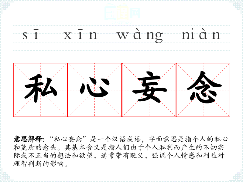 “私心妄念”是一个汉语成语,字面意思是指个人的私心和荒唐的念头。其基本含义是指人们由于****而产生的不切实际或不正当的想法和欲望,通常带有贬义,强调个人情感和利益对理智判断的影响。