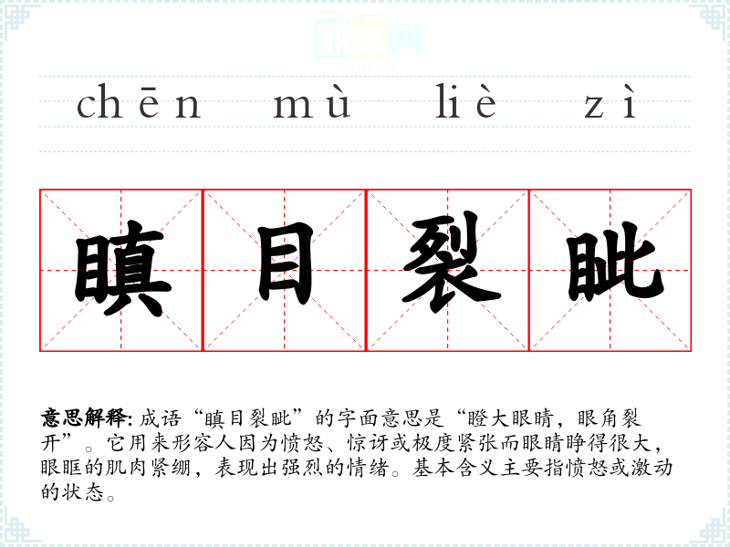 - 同义成语:怒目而视(愤怒地盯着某人),“瞋目”强调愤怒的状态,“裂眦”则侧重于眼角的紧绷与不适。
