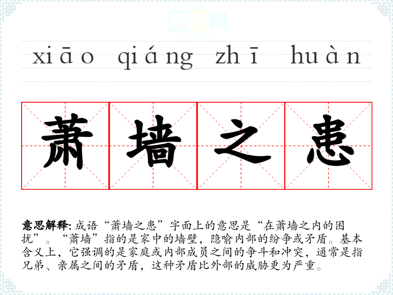 成语“萧墙之患”字面上的意思是“在萧墙之内的困扰”。“萧墙”指的是家中的墙壁,隐喻内部的纷争或矛盾。基本含义上,它强调的是家庭或内部成员之间的争斗和冲突,通常是指兄弟、亲属之间的矛盾,这种矛盾比外部的威胁更为严重。