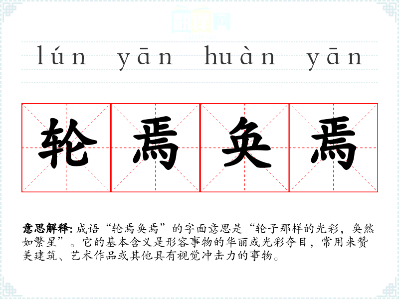 成语“轮焉奂焉”的字面意思是“**那样的光彩,奂然如繁星”。它的基本含义是形容事物的华丽或光彩夺目,常用来赞美建筑、艺术作品或其他具有视觉冲击力的事物。