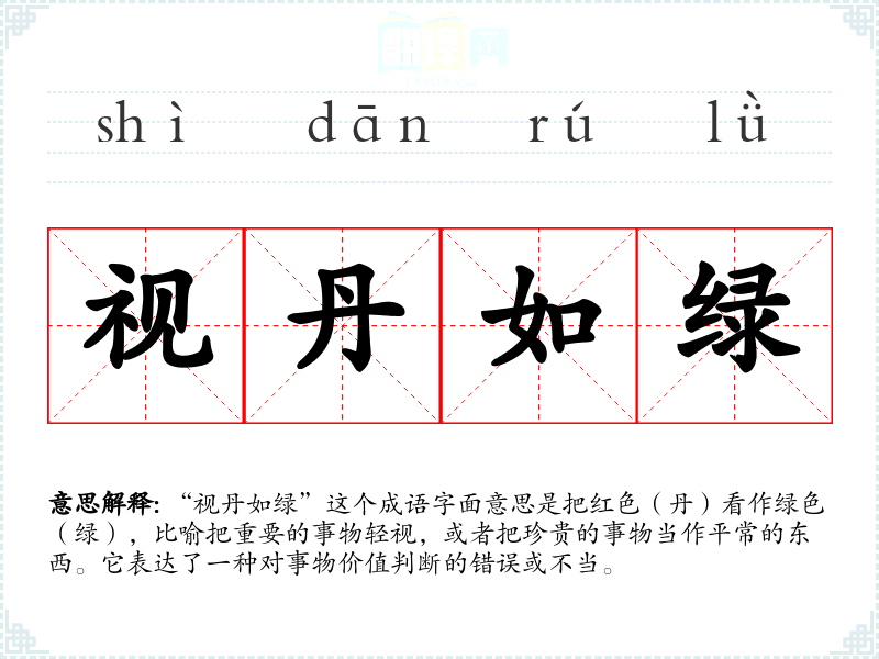 “视丹如绿”这个成语字面意思是把红色(丹)看作绿色(绿),比喻把重要的事物轻视,或者把珍贵的事物当作平常的东西。它表达了一种对事物价值判断的错误或不当。