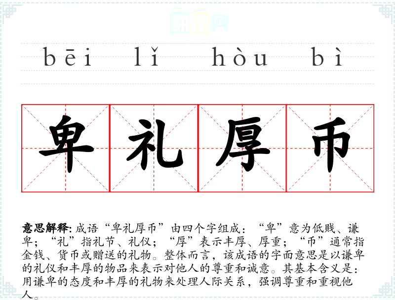 成语“卑礼厚币”由四个字组成:“卑”意为低贱、谦卑;“礼”指礼节、礼仪;“厚”表示丰厚、厚重;“币”通常指金钱、货币或赠送的礼物。整体而言,该成语的字面意思是以谦卑的礼仪和丰厚的物品来表示对他人的尊重和诚意。其基本含义是:用谦卑的态度和丰厚的礼物来处理人际关系,强调尊重和重视他人。