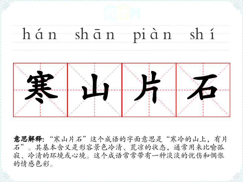 “寒山片石”这个成语的字面意思是“寒冷的山上,有片石”。其基本含义是形容景色冷清、荒凉的状态,通常用来比喻孤寂、冷清的环境或心境。这个成语常常带有一种淡淡的忧伤和惆怅的情感色彩。
