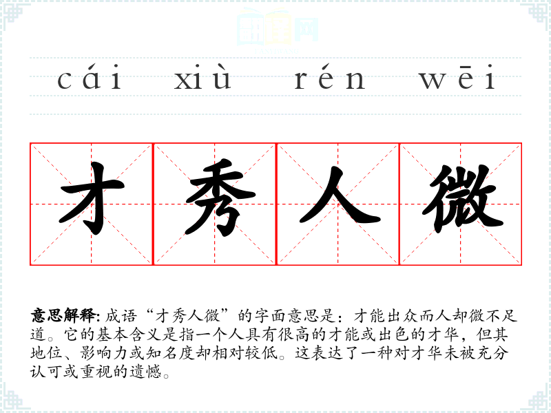 成语“才秀人微”的字面意思是:才能出众而人却微不足道。它的基本含义是指一个人具有很高的才能或出色的才华,但其地位、影响力或知名度却相对较低。这表达了一种对才华未被充分认可或重视的遗憾。