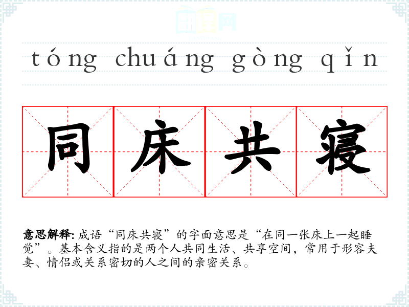 成语“同床共寝”的字面意思是“在同一张床上一起睡觉”。基本含义指的是两个人共同生活、共享空间,常用于形容夫妻、情侣或关系密切的人之间的亲密关系。