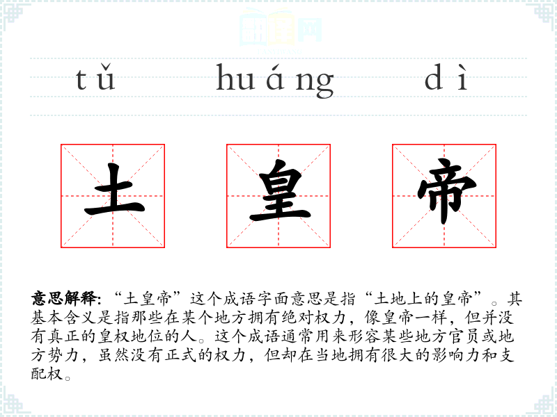 “土”这个成语字面意思是指“土地上的”。其基本含义是指那些在某个地方拥有绝对权力,像**一样,但并没有真正的皇权地位的人。这个成语通常用来形容某些地方官员或地方势力,虽然没有正式的权力,但却在当地拥有很大的影响力和支配权。