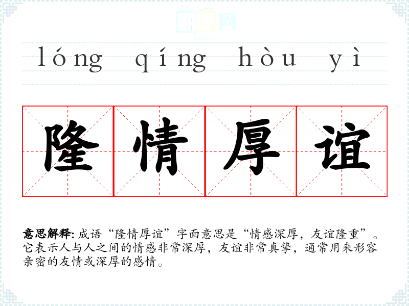 成语“隆情厚谊”字面意思是“情感深厚,友谊隆重”。它表示人与人之间的情感非常深厚,友谊非常真挚,通常用来形容亲密的友情或深厚的感情。