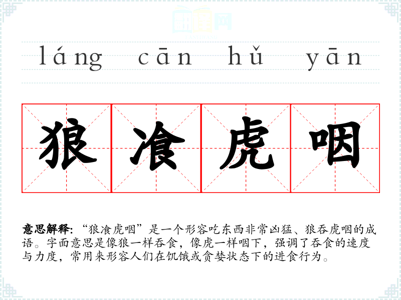 - 狼吞虎咽:与“狼飡虎咽”意思相近,多用于形容进食时的凶猛与迅速。