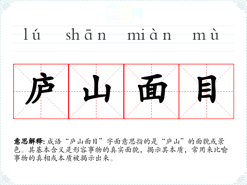 成语“庐山面目”字面意思指的是“庐山”的面貌或景色。其基本含义是形容事物的真实面貌,揭示其本质,常用来比喻事物的真相或本质被揭示出来。