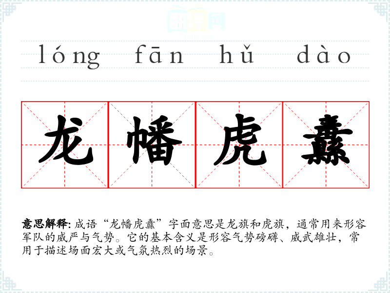成语“龙幡虎纛”字面意思是龙旗和虎旗,通常用来形容军队的威严与气势。它的基本含义是形容气势磅礴、威武雄壮,常用于描述场面宏大或气氛热烈的场景。