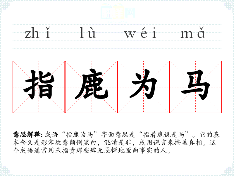 成语“指鹿为马”字面意思是“指着鹿说是马”。它的基本含义是形容故意颠倒黑白,混淆是非,或用谎言来掩盖真相。这个成语通常用来指责那些肆无忌惮地歪曲事实的人。