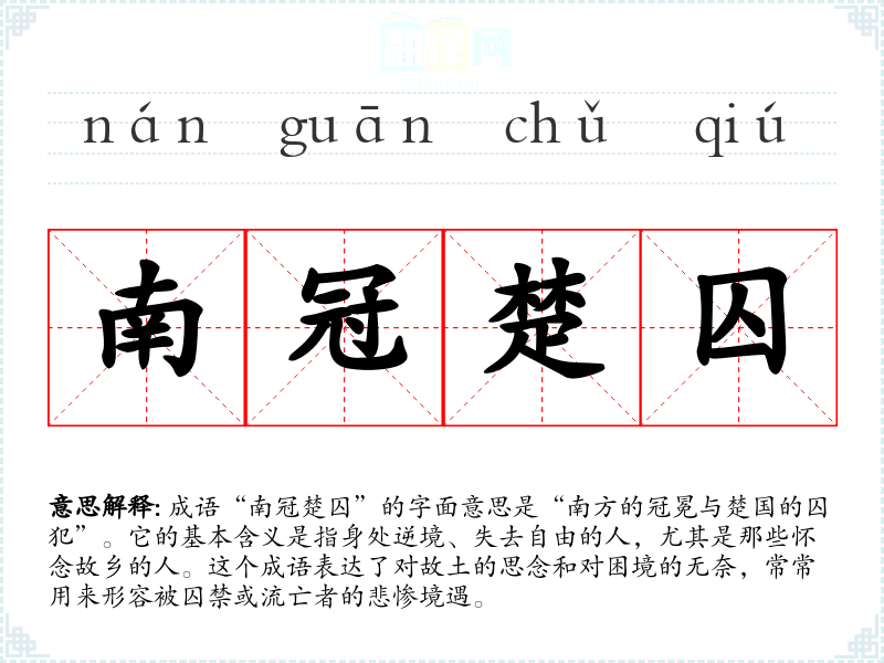成语“南冠楚囚”的字面意思是“南方的冠冕与楚国的囚犯”。它的基本含义是指身处逆境、失去自由的人,尤其是那些怀念故乡的人。这个成语表达了对故土的思念和对困境的无奈,常常用来形容被囚禁或流亡者的悲惨境遇。