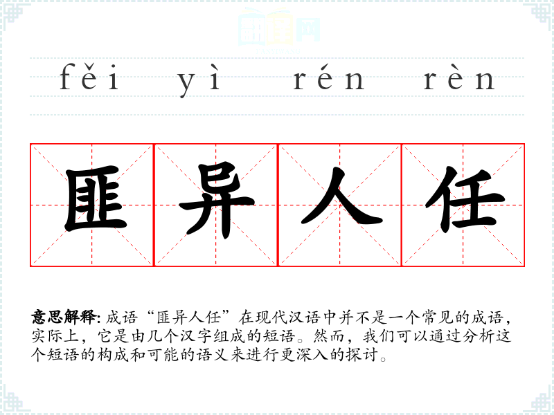 成语“匪异人任”在现代汉语中并不是一个常见的成语,实际上,它是由几个汉字组成的短语。然而,我们可以通过分析这个短语的构成和可能的语义来进行更深入的探讨。