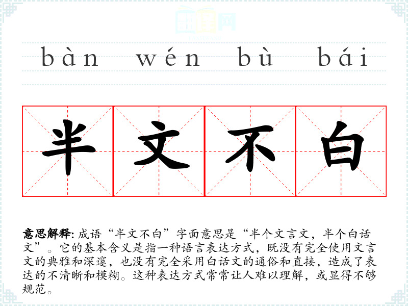成语“半文不白”字面意思是“半个文言文,半个白话文”。它的基本含义是指一种语言表达方式,既没有完全使用文言文的典雅和深邃,也没有完全采用白话文的通俗和直接,造成了表达的不清晰和模糊。这种表达方式常常让人难以理解,或显得不够规范。