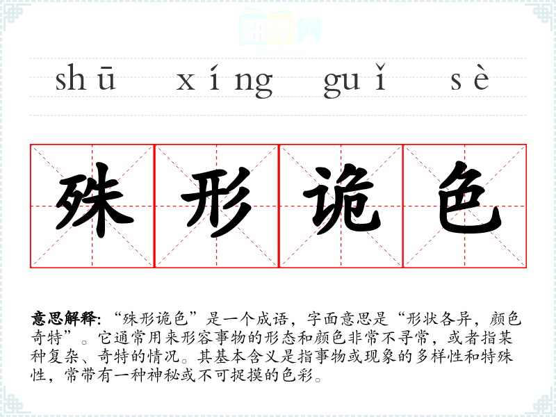 “殊形诡色”是一个成语,字面意思是“形状各异,颜色奇特”。它通常用来形容事物的形态和颜色非常不寻常,或者指某种复杂、奇特的情况。其基本含义是指事物或现象的多样性和特殊性,常带有一种神秘或不可捉摸的色彩。