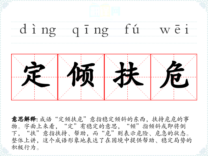 成语“定倾扶危”意指稳定倾斜的东西,扶持危危的事物。字面上来看,“定”有稳定的意思,“倾”指倾斜或即将倒下,“扶”意指扶持、帮助,而“危”则表示危险、危急的状态。整体上讲,这个成语形象地表达了在困境中提供帮助、稳定局势的积极行为。