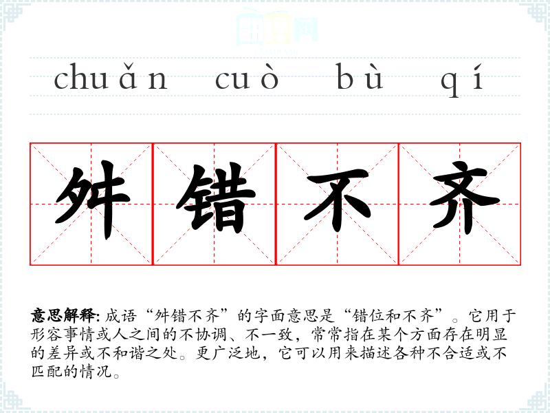 成语“舛错不齐”的字面意思是“错位和不齐”。它用于形容事情或人之间的不协调、不一致,常常指在某个方面存在明显的差异或不和谐之处。更广泛地,它可以用来描述各种不合适或不匹配的情况。