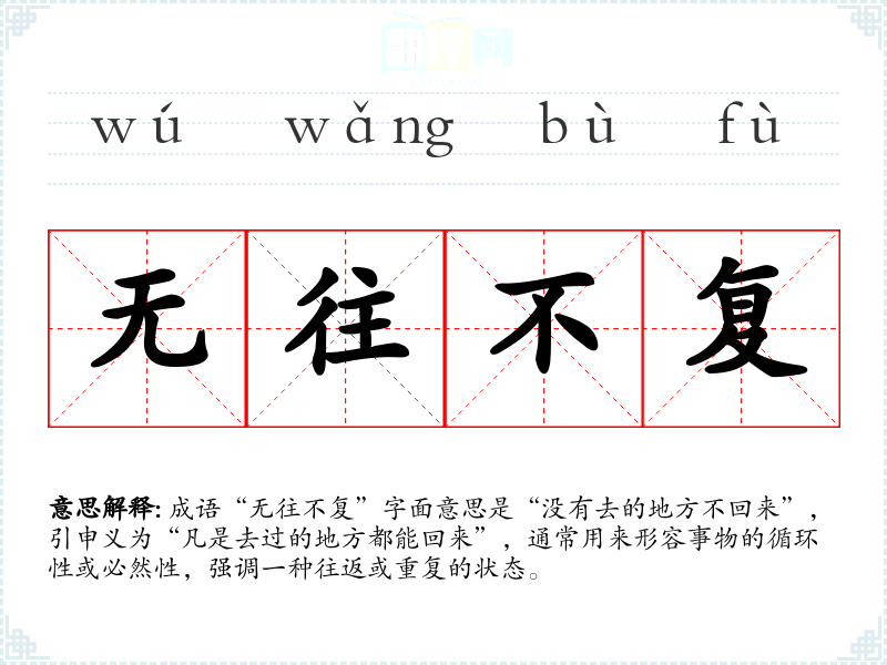 成语“无往不复”字面意思是“没有去的地方不回来”,引申义为“凡是去过的地方都能回来”,通常用来形容事物的循环性或必然性,强调一种往返或重复的状态。
