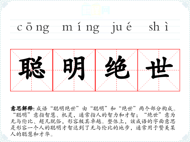 成语“聪明绝世”由“聪明”和“绝世”两个部分构成。“聪明”意指智慧、机灵,通常指人的智力和才智;“绝世”意为无与伦比、超凡脱俗,形容极其卓越。整体上,该成语的字面意思是形容一个人的聪明才智达到了无与伦比的地步,通常用于赞美某人的聪慧和才华。