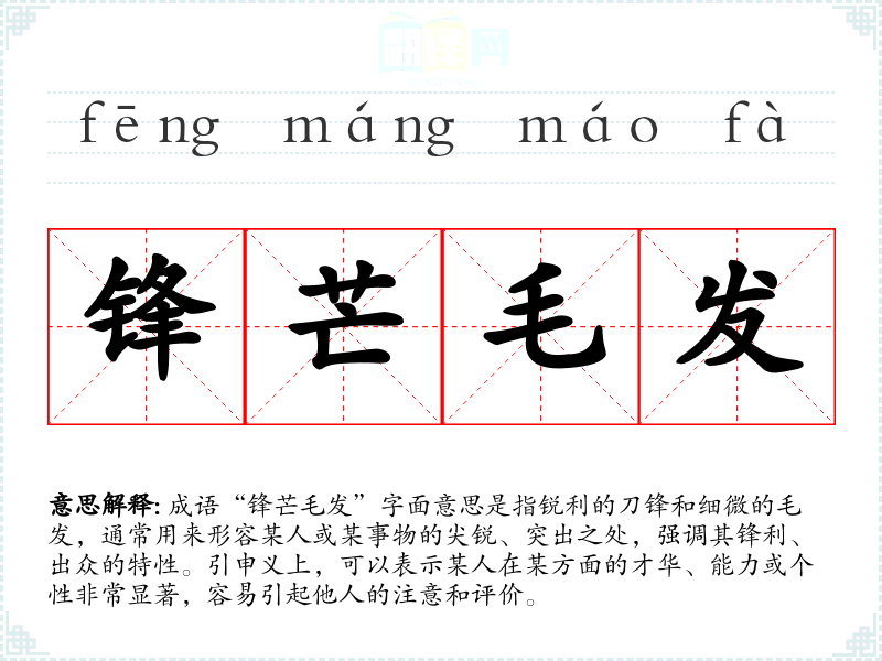 “锋芒毛发”并不是一个传统的成语,而是由“锋芒”和“毛发”两个词组合而成的表达。“锋芒”本身意指刀剑的锋利边缘,常用来形容才华横溢的人;“毛发”则是细微之物。这个组合通常用于强调在某一特定方面的出众表现。