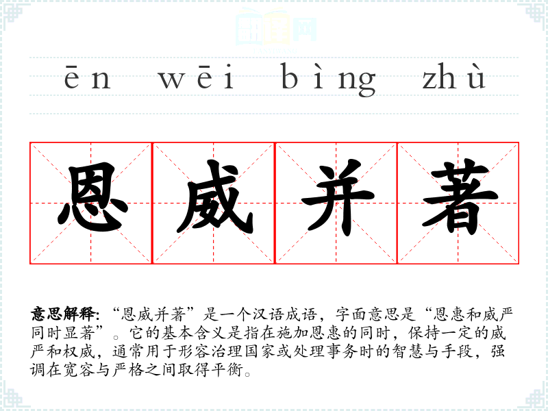 “恩威并著”是一个汉语成语,字面意思是“恩惠和威严同时显著”。它的基本含义是指在施加恩惠的同时,保持一定的威严和权威,通常用于形容治理国家或处理事务时的智慧与手段,强调在宽容与严格之间取得平衡。