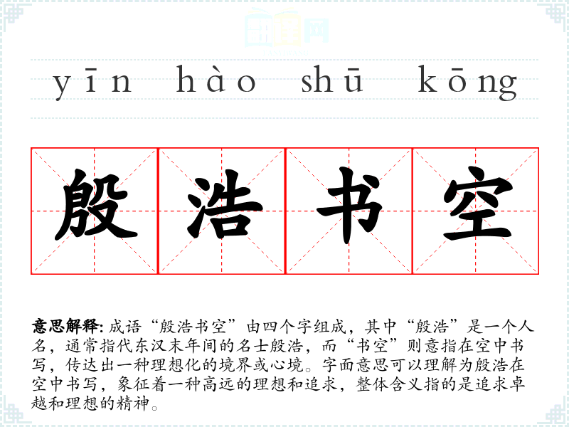 成语“殷浩书空”由四个字组成,其中“殷浩”是一个人名,通常指代东汉末年间的名士殷浩,而“书空”则意指在空中书写,传达出一种理想化的境界或心境。字面意思可以理解为殷浩在空中书写,象征着一种高远的理想和追求,整体含义指的是追求卓越和理想的精神。