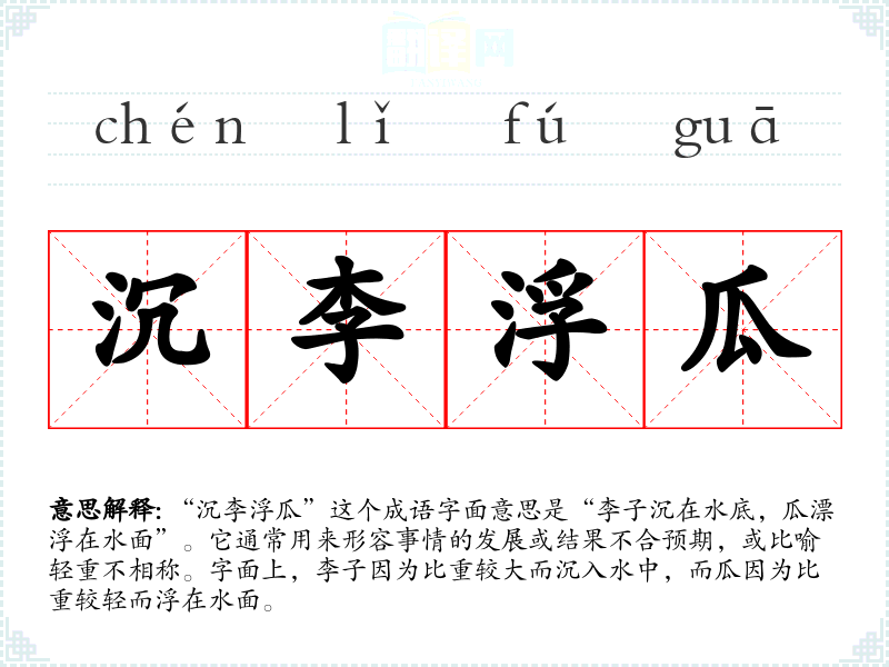 在**文化中,成语往往蕴含深厚的历史和哲理。“沉李浮瓜”不仅反映了物质的轻重,还可以引申为人际关系、社会地位等方面的思考。在现代社会,这个成语仍然适用于描述不公正现象或意料之外的结果。