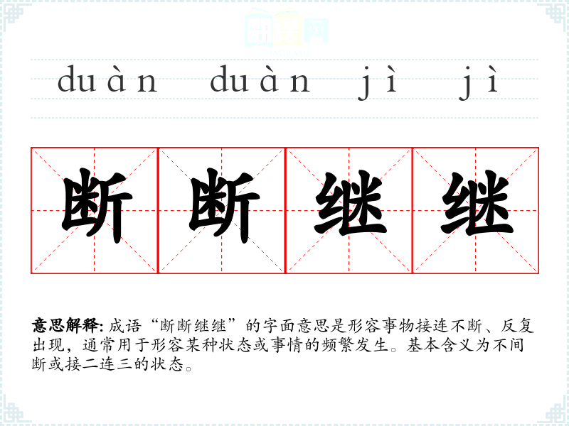 成语“断断继继”的字面意思是形容事物接连不断、反复出现,通常用于形容某种状态或事情的频繁发生。基本含义为不间断或接二连三的状态。