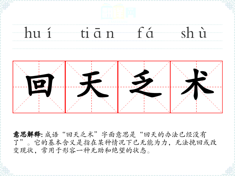 成语“回天乏术”字面意思是“回天的办法已经没有了”。它的基本含义是指在某种情况下已无能为力,无法挽回或改变现状,常用于形容一种无助和绝望的状态。