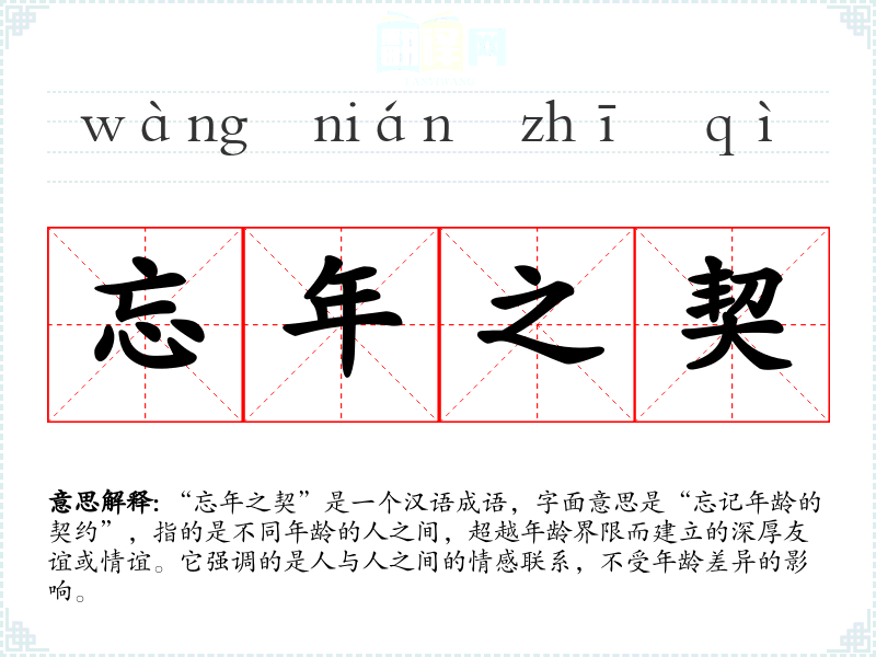 “忘年之契”是一个汉语成语,字面意思是“忘记年龄的契约”,指的是不同年龄的人之间,超越年龄界限而建立的深厚友谊或情谊。它强调的是人与人之间的情感联系,不受年龄差异的影响。