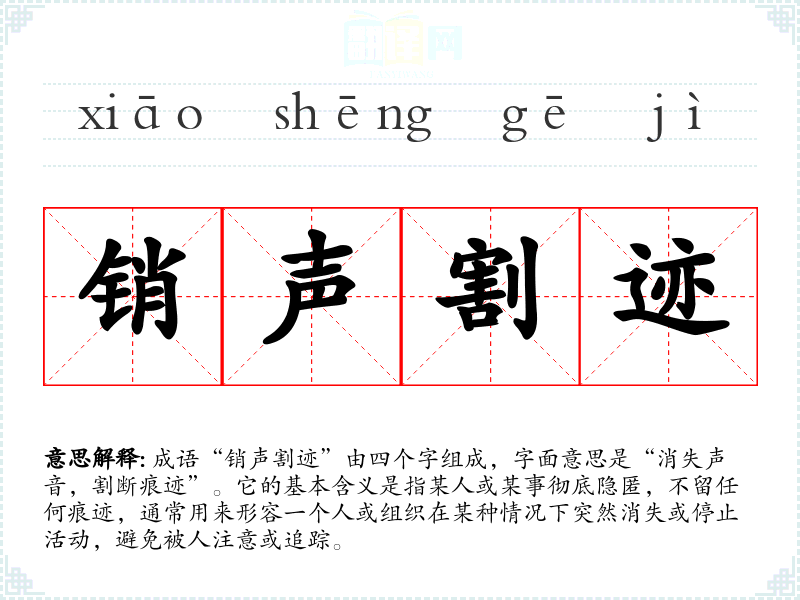 成语“销声割迹”由四个字组成,字面意思是“消失声音,割断痕迹”。它的基本含义是指某人或某事彻底隐匿,不留任何痕迹,通常用来形容一个人或组织在某种情况下突然消失或停止活动,避免被人注意或追踪。