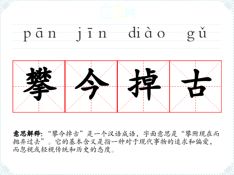 “攀今掉古”的具体来源并没有明确的历史典故,但可以推测其形成是在对比现代与古代的背景下。这样的表达常见于对现代化进程中传统文化被忽视的批评,反映了人们对传统文化价值的关注与思考。
