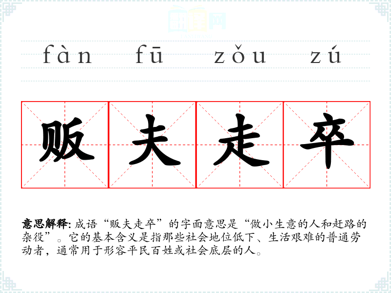 成语“贩夫走卒”的字面意思是“做小生意的人和赶路的杂役”。它的基本含义是指那些社会地位低下、生活艰难的普通劳动者,通常用于形容平民百姓或社会底层的人。