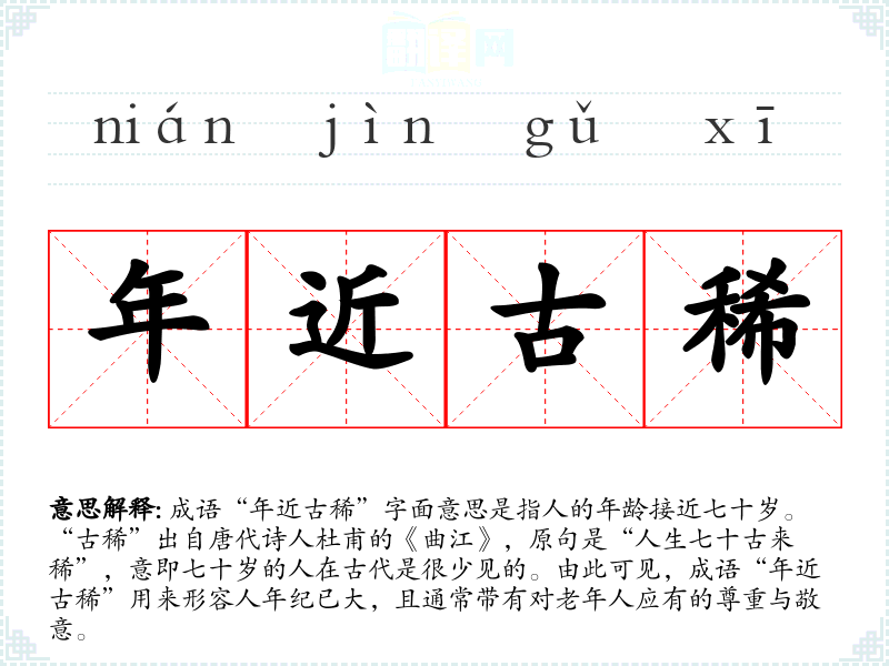 成语“年近古稀”字面意思是指人的年龄接近七十岁。“古稀”出自唐代诗人杜甫的《曲江》,原句是“人生七十古来稀”,意即七十岁的人在古代是很少见的。由此可见,成语“年近古稀”用来形容人年纪已大,且通常带有对老年人应有的尊重与敬意。