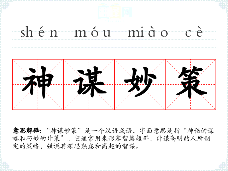 “神谋妙策”这个成语的具体来源并不明确,但它包含了“神”和“妙”两词的传统文化意涵。在古代,智者被视为具备神秘智慧的人,常常在战争或政治斗争中通过高明的策略取得胜利。因此,这个成语可以理解为对古代智者谋略的赞美,也体现了**文化中对智慧和策略的重视。