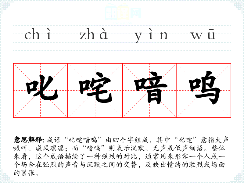 成语“叱咤喑呜”由四个字组成,其中“叱咤”意指大声喊叫、威风凛凛;而“喑呜”则表示沉默、无声或低声细语。整体来看,这个成语描绘了一种强烈的对比,通常用来形容一个人或一个场合在强烈的声音与沉默之间的交替,反映出情绪的激烈或场面的紧张。
