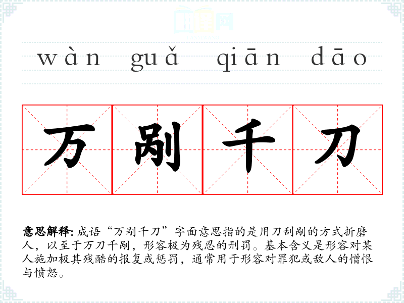 成语“万剐千刀”字面意思指的是用刀刮剐的方式折磨人,以至于万刀千剐,形容极为残忍的刑罚。基本含义是形容对某人施加极其残酷的报复或惩罚,通常用于形容对罪犯或敌人的憎恨与愤怒。