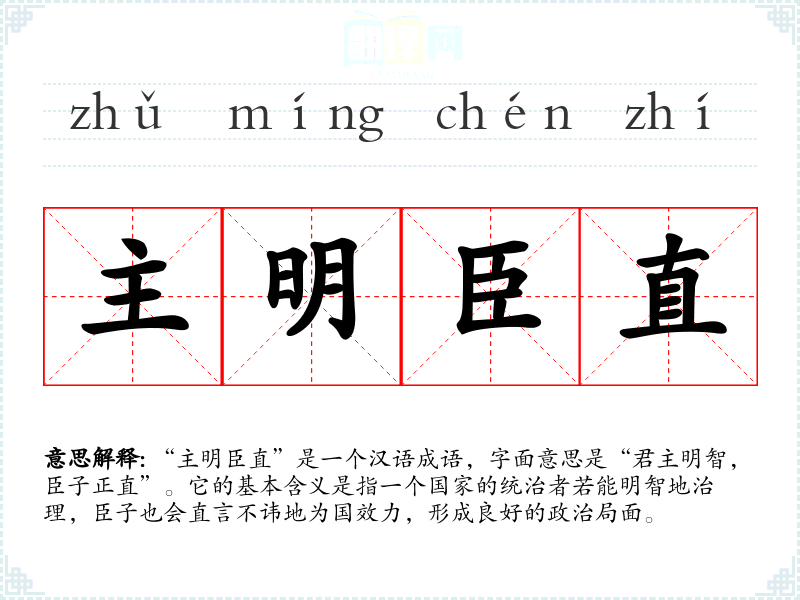 “主明臣直”是一个汉语成语,字面意思是“君主明智,臣子正直”。它的基本含义是指一个国家的统治者若能明智地治理,臣子也会直言不讳地为国效力,形成良好的政治局面。