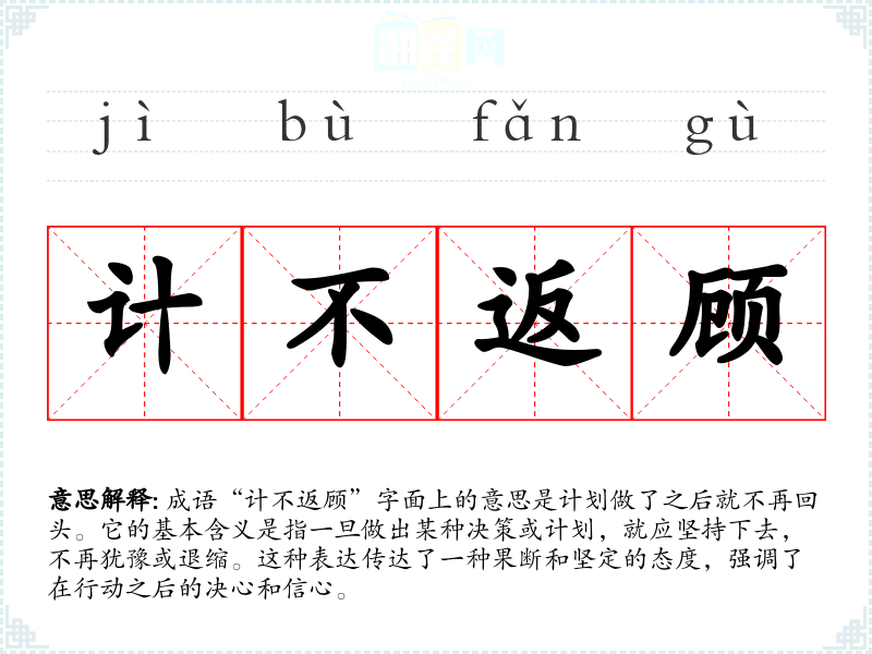 “计不返顾”来源于古代的军事和政治决策。当时,指挥官在制定战略和计划时,必须果断地执行,而不能因为环境的变化或外界的压力而产生动摇。这种思想常常可以在古典文学中找到,如《史记》中对历史人物决策的描述,强调了决策后的坚定态度。
