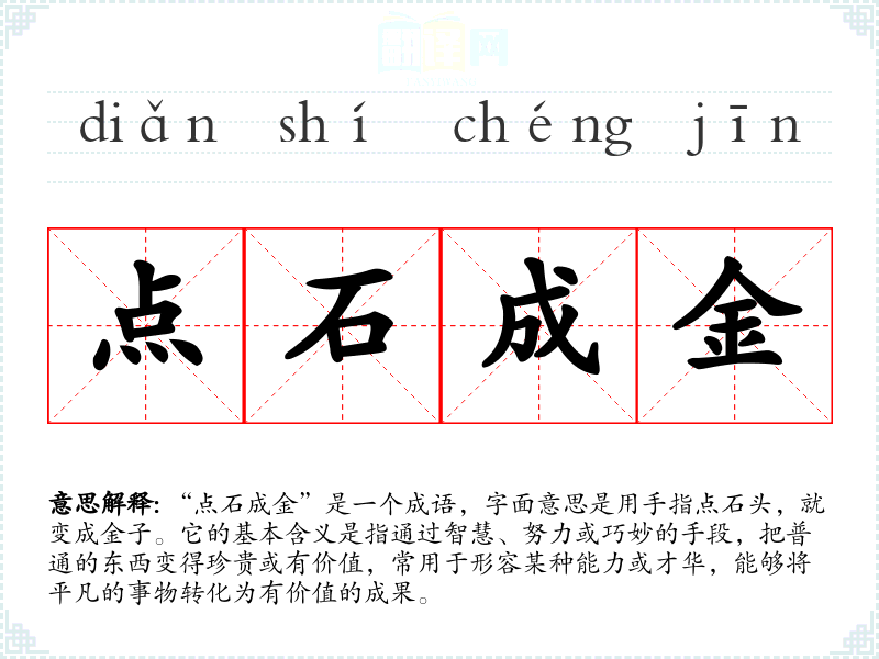 “点石成金”是一个成语,字面意思是用手指点石头,就变成金子。它的基本含义是指通过智慧、努力或巧妙的手段,把普通的东西变得珍贵或有价值,常用于形容某种能力或才华,能够将平凡的事物转化为有价值的成果。