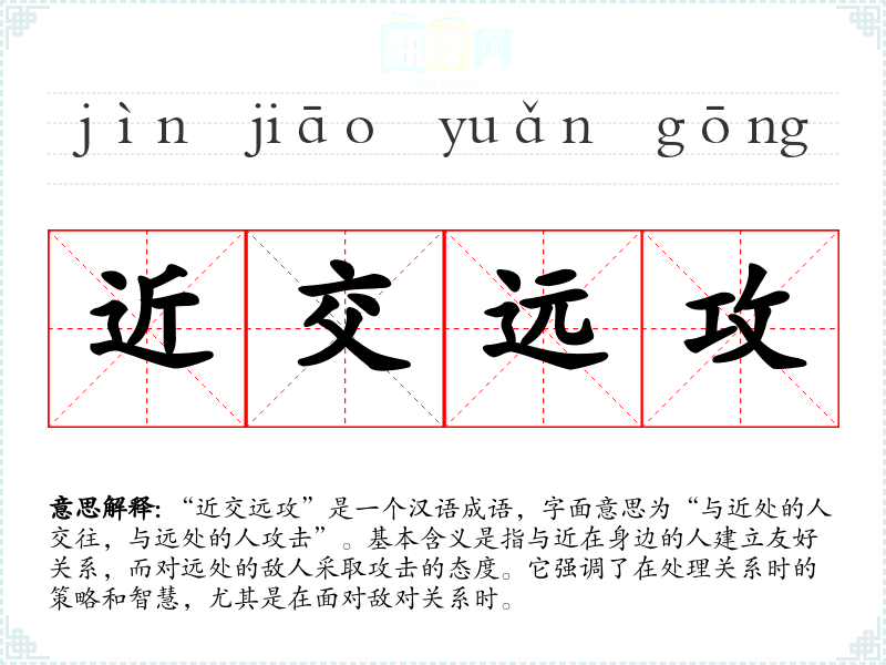 在**历史上,许多战争和外交策略都体现了“近交远攻”的思想。这一成语不仅在军事上适用,在现代社会的商业、政治和人际关系中,也同样适用。尤其在全球化的背景下,国家之间的关系更加复杂,如何处理“近”和“远”的关系成为了重要的议题。