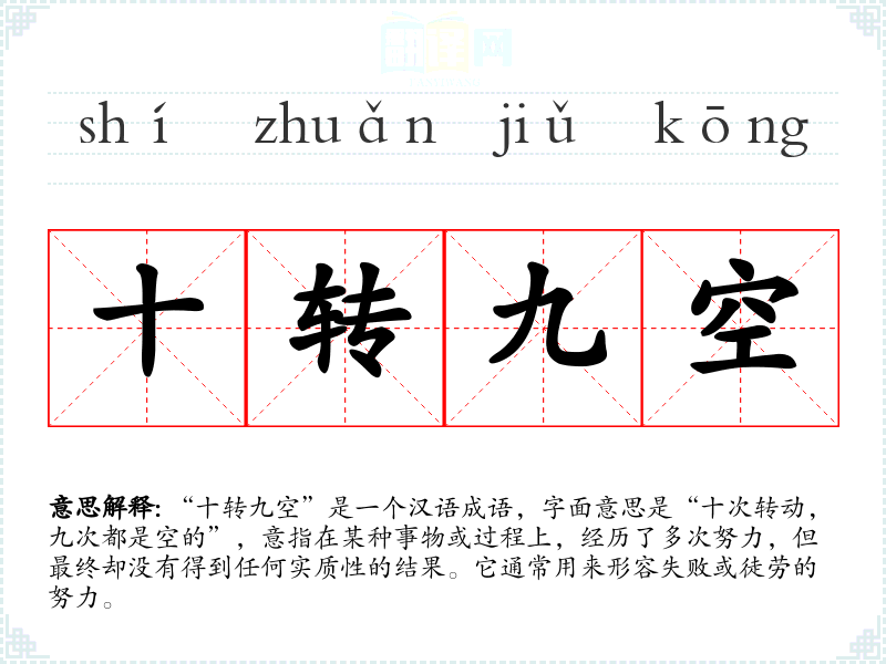 “十转九空”是一个汉语成语,字面意思是“十次转动,九次都是空的”,意指在某种事物或过程上,经历了多次努力,但最终却没有得到任何实质性的结果。它通常用来形容失败或徒劳的努力。