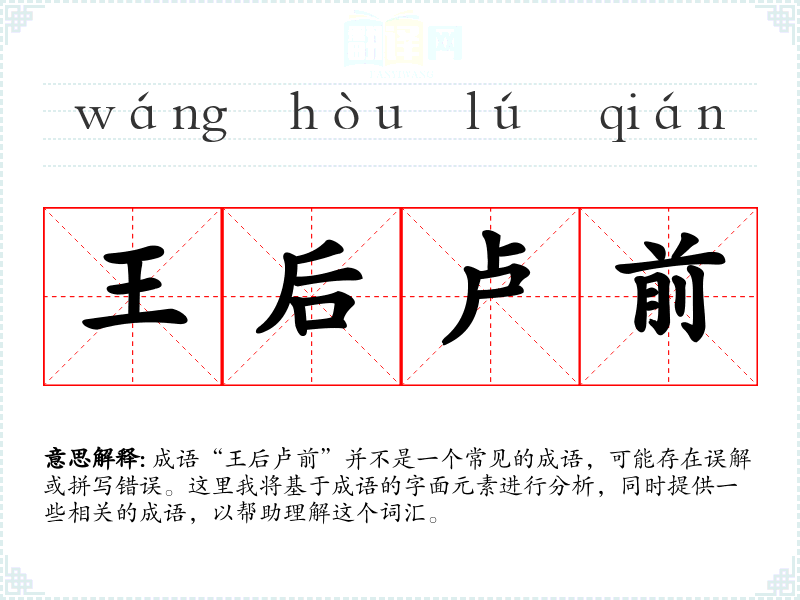 成语“王后卢前”并不是一个常见的成语,可能存在误解或拼写错误。这里我将基于成语的字面元素进行分析,同时提供一些相关的成语,以帮助理解这个词汇。