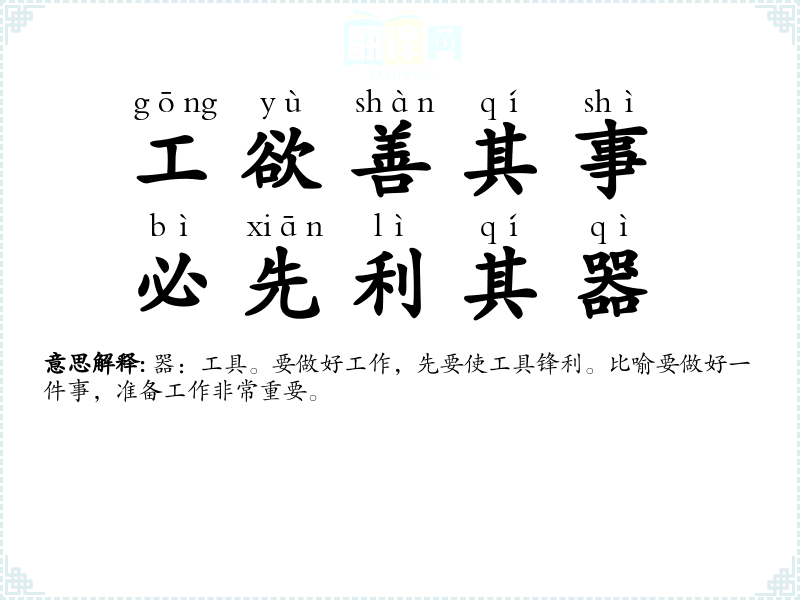 器:工具。要做好工作,先要使工具锋利。比喻要做好一件事,准备工作非常重要。 |