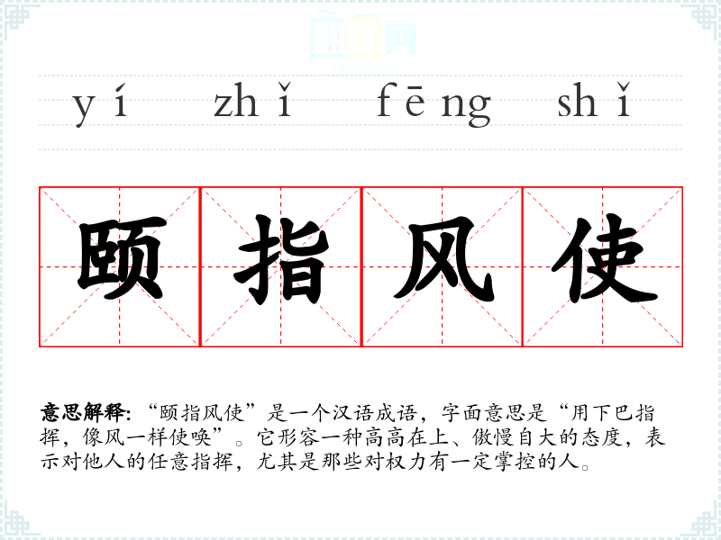 | 颐指风使 | 以下巴的动向和脸色来指挥人。常以形容指挥别人时的傲慢态度。 |