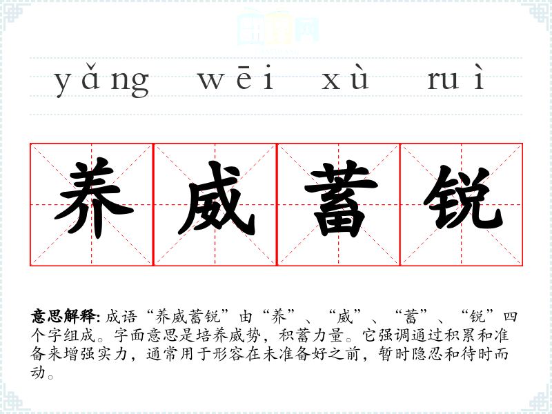 “养威蓄锐”给人的情感反应通常是安静、沉稳和耐心的。它让我联想到那些在逆境中坚持不懈的人,他们不急于求成,而是默默努力,等待机会的来临。这样的态度常常令人钦佩。