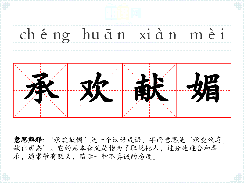 “承欢献媚”是一个汉语成语,字面意思是“承受欢喜,献出媚态”。它的基本含义是指为了取悦他人,过分地迎合和奉承,通常带有贬义,暗示一种不真诚的态度。