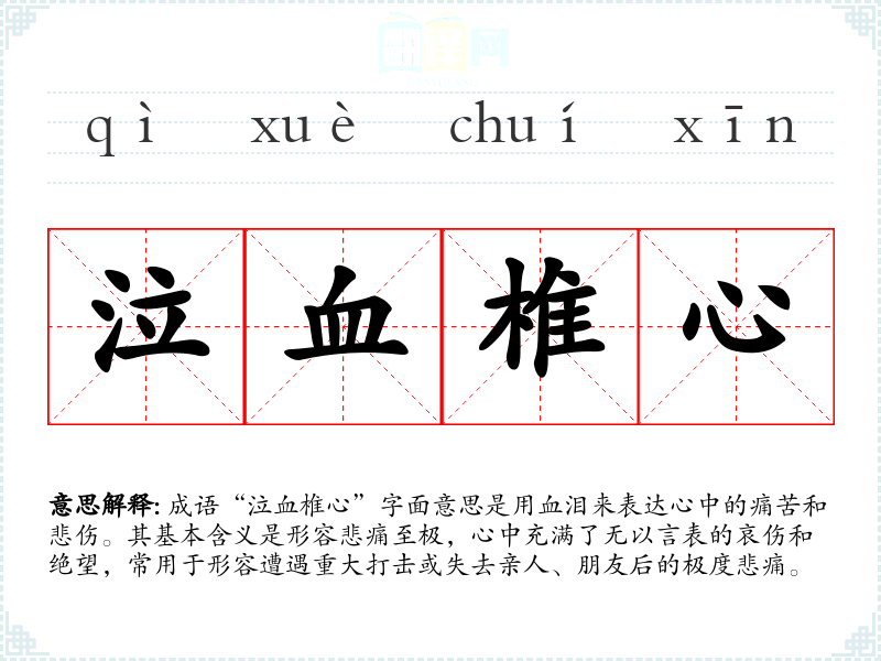 成语“泣血椎心”字面意思是用血泪来表达心中的痛苦和悲伤。其基本含义是形容悲痛至极,心中充满了无以言表的哀伤和绝望,常用于形容遭遇重大打击或失去亲人、朋友后的极度悲痛。